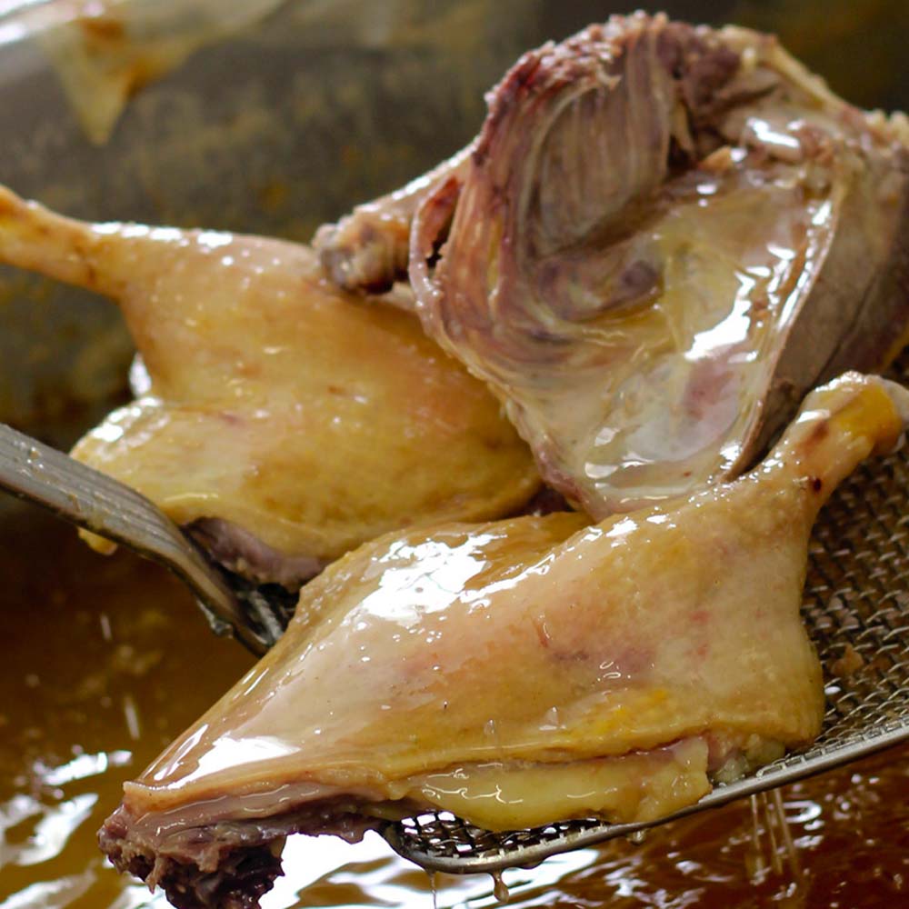 Pour cela, les canards sont élevés en plein air durant 13 semaines, (nous les recevons à 1 jour) en bandes de 540, avec 20 m² / canard (au lieu des 10 exigés par les normes UE). Nous élevons, gavons et transformons environ 7 000 canards à l’année. Tout est fait sur place, dans notre propre laboratoire, inauguré en 2015.
